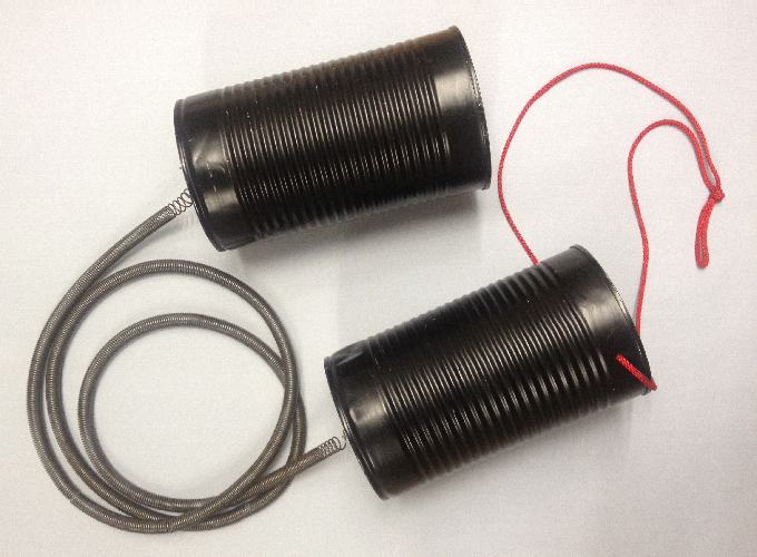 FedergongDer Federgong sieht im Prinzip aus, wie das aus der Kindheit bekannte Dosentelefon: 2 Konservendosen, die mit einer gespannten Schnur verbunden sind. Beim Federgong wird die Schnur durch eine Spiralfeder ersetzt. Wird die Feder erregt, schwingt sie sich auf, die Konservebdosen verstärken den Klang: es entstehen Töne, die wie ein verhallter Gong klingen. |