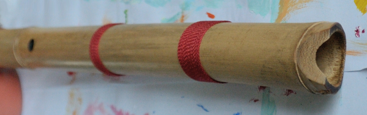 ShakuhachiDie shakuhachi ist eine japanische Bambuslängsflöte mit einem weichen rauschigem Klang. Sie stammt von der chinesischen xiao ab. Sie wird aus Bambus gefertigt. Die Standardlänge beträgt bei d' Stimmung 54,5 cm bzw. 1 Shaku und 8 (hachi) Sun. Shakuhachis gibt es von 1,5 (g' Stimmung) bis 2,4 Shaku Länge (a Stimmung). |