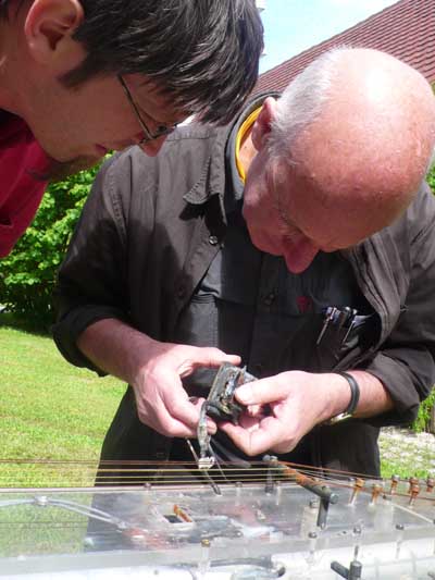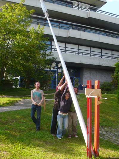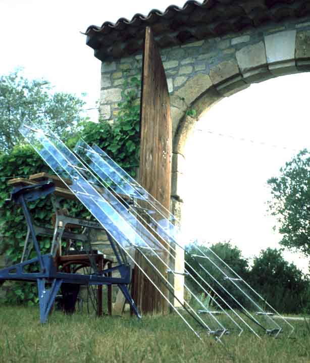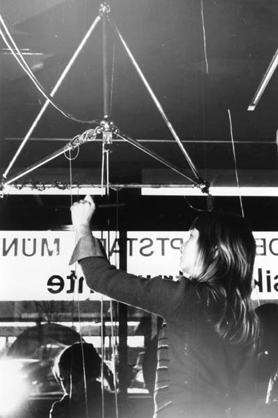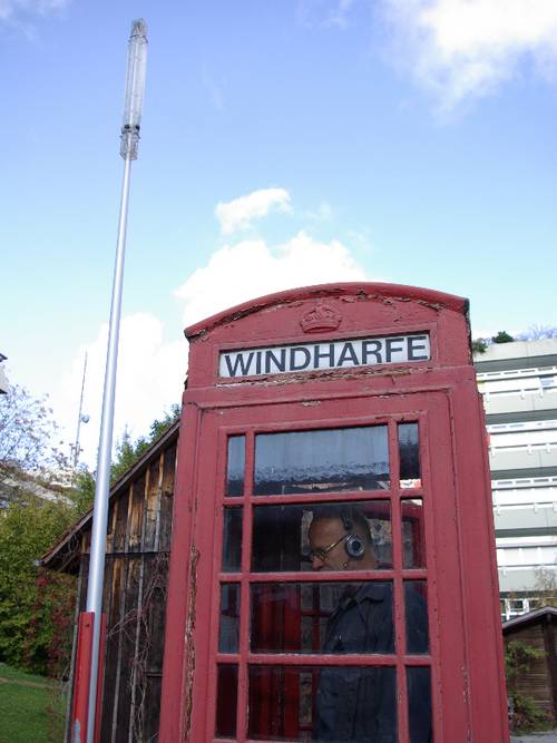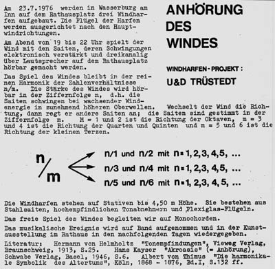 "Musik+ Instrumente" im Kunstzentrum Neuperlach München Am 23.7.1976 werden in Wasserburg am Inn auf dem Rathausplatz drei Windharfen aufgebaut. Die Flügel der Harfen werden ausgerichtet nach den Haupt-Windrichtungen. Am Abend von 19 bis 22 Uhr spielt der Wind mit den Saiten, deren Schwingungen elektronisch verstärkt und dreikanalig über Lautsprecher auf dem Rathausplatz hörbar gemacht werden. Das Spiel des Windes bleibt in der reinen Harmonik der Zahlenverhältnisse n/m. Die Stärke des Windes wird hörbar in der Ziffernfolge n, d.h. die Saiten schwingen bei wachsender Windenergie in zunehmend höheren Oberwellen. Wechselt der Wind die Richtung, dann regt er andere Saiten an; die Saiten sind gestimmt in der Ziffernfolge m. M = 1 und 2 ist die Richtung der Oktaven, m = 3 und 4 ist die Richtung der Quarten und Quinten und m = 5 und 6 ist die Richtung der kleinen Terzen. Windharfe auf dem Bücherturm in Gent Siehe: http://www.luise37.de/windharfe/windharfen.htm
