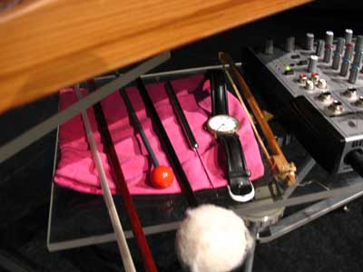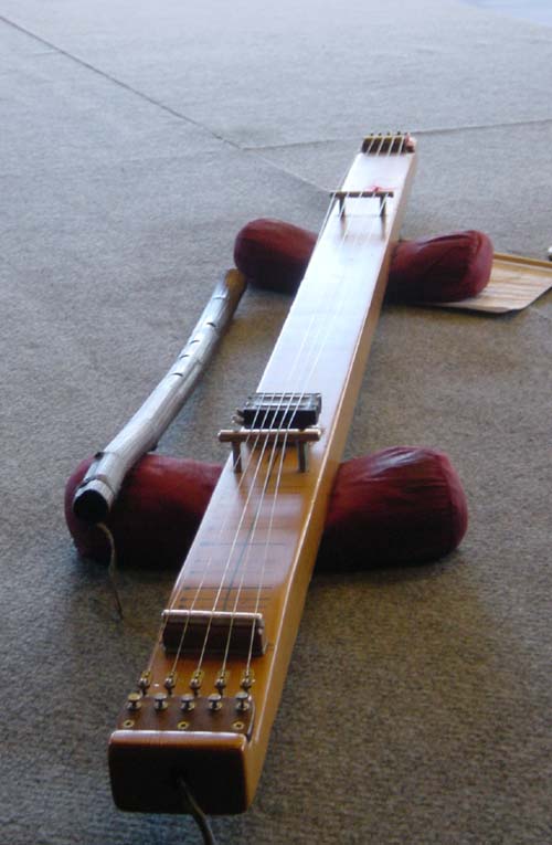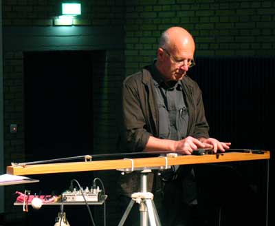 Windharfe - Chin-Instrument - Die Ulmer Windharfe ist jetzt als livestream weltweit und in real time hörbar: http://windharfe.campus.uni-ulm.de/windharfe.m3u und fürs Handy - livestream - lautet die Adresse: natürlich nur wenn der Wind geht. Das Chin-Instrument Um das verwendete Instrument vom klassischen, chinesischen Ch'in - auch Guqin geannt - zu unterscheiden, setze ich den Begriff Instrument dazu. Dieses Instrument besteht aus einem Zedernholzbrett (wegen des geringen Gewichtes und der Stabilität), auf dem 5 Saiten gespannt sind. Die Stege der Saiten haben rechts eine Saitenverlängerung von einer Oktave und links eine Verlängerung von einer Quinte. Wesentlich ist der Tonabnehmer: Er ist selbst gebaut und hat eine hohe Qualität in der Klangwiedergabe und der Rausch-Freiheit. Der Tonabnehmer wirkt wie ein Klangmikroskop. Es werden Klänge klar wiedergegeben, die normalerweise unhörbar sind. Wir können auf diese Weise in die Tiefe der Klänge hineinhören. Die Stimmung der Saiten ist 4 - 5 - 6 - 7 - 8. Die Zahlen bedeuten die jeweiligen Teiltöne. Das heißt: musikalisch: Grundton - große Terz - Quinte - Naturseptime und Oktave. Das Spielmaterial ist der Atem (die Saiten anblasen), das Plektrum (die Saiten zupfen), ein Glasstab (die Saiten anschlagen und auch zum Glissandi-Spiel), ein Federstab (in einem Metallkörper ist ein Stück Klaviersaite montiert) und der Bogen. Wir können die Saiten auch Ansingen (am besten das Holz mit den Zähnen berühren). Das Anblasen der Saiten beim konzertanten Aufführungen ist ziemlich spektakulär - als wesentlicher Bestandteil der Musik in Interrogations (Yoshi Oida). Es bezieht sich auf das Koan: die Fahne flattert im Wind - ist es die Fahne die im Wind flattert? oder ist der Wind, der die Fahne zum Flattern bringt? oder ist es euer Geist, der die Fahne im Wind flattern läßt? Vom Instrumentenbau her gesehen, war es reizvoll, den Tonabnehmer so effektiv zu machen, dass auch leichtes Anblasen der Saiten hörbar wird. Die Saiten können mit dem Atem einzeln und eindeutig gespielt werden. Wenn der Wind die Harfe spielt, kommt der Begriff der Absichtslosigkeit in das Spiel (John Cage !). Man kann der Windharfe ohne Ermüdung zu hören, weil man keinen Höhepunkt, keine Spannung und Entspannung, keine Emotionen etc. erwartet. Es ist einfach da. Beim Anblasen der Saiten ist man konzertant tätig, will etwas ausdrücken, etwas kommentieren, etwas darstellen. Das ist eine zeitlich begrenzte Musik. Die Musik der Windharfen-Installation hat die Begrenzungen nicht, sie ermüdet den Zuhörer nicht. Verfolge ich den Gedanken, das Konzept, einer Konzert-Installation, dann kann ich solche ruhigen, gleichbleibenden Klangbilder ebenfalls setzen. Der Zuhörer kann zuhören, nicht zuhören, weggehen, zurückkommen und nochmal hören. Er weiß, dass es keine Geschichte, keine Episode gibt. Der Zuhörer ist in seinem Kopf in einem anderen Zustand, eher in dem Zustand: ein Phänomen wahrnehmen, keine sequentielle Story. Das hat auch etwas mit den verschiedenen Gehirn-Bereichen zu tun - siehe Oliver Sacks. Wesentlich Haltung beim Spiel des Instrumentes ist das Zuhören, dem Instrument zuhören. Das Instrument überrascht den Spieler immerwieder mit seinen Antworten. 1978 entwickelten wir (Ulrike und Dieter Trüstedt) das Stück TOUCHING. Es besteht aus 24 Motiven, Spielanweisungen für Klangbilder. Es sind Grundbilder analog zu den Klangbildern des klassischen chinesischen Guqin. TOUCHING wurde sehr oft aufgeführt - in den 1980er Jahren - und schließlich auch erweitert. Neu unter den Klängen ist vor allem das Anstreichen der Saiten mit einem Violinbogen. Der rechte Steg wurde so verändert, dass alle 5 Saiten anstreichbar sind. Diese Instrument spielt in den Arbeiten mit Yoshi Oida eine wesentliche Rolle: Interrogations (Zen-Bilder, als Text, Schauspiel, Pantomik und Musik dargestellt), Komatshi (Meta Theaer) und Molly Sweeney (Oliver Sack, Yoshi Oida - Ballett, Schauspielhaus Nürnberg). Interrogations wird 7.-9. Oktober 2010 im Japanischen Institut New York von Yoshi Oida und Dieter Trüstedt aufgeführt. Seit 2009 wird das Chin-Instrument auch mit Computer-Musik in Verbindung gebracht - siehe www.luise37.de. Das Chin-Instrument liefert Basisklänge, die mit dem Pure-Data-Programm weiterverarbeitet werden (Echo, Loops, Raum-Zeit-Melodien, Faltungen). Das Chin-Instrument ermöglicht unmittelbar komplexe Klänge zu erzeugen. Die Reaktion während der Aufführung (vor allem im Kontext von Tanz-Theatern) ist mit Chin-Instrument direkt, ohne Umsetzung in Melodien oder Rhythmen. Der Klang ist hier die erste Instanz der künstlerischen Antwort. Chin-Instrument als Installation Die frühesten Erfahrungen mit den Klängen des Windes auf Saiten war 1973 - siehe Foto mit Drachen, Mikrofon und Revox-Tonbandgerät. Der Wind bewegt den Drachen. Die Perlonschnur singt dadurch in verschiedenen Tonhöhen. Das Holzbrett am Ende der Drachenschnur verstärkt zusätzlich den Klang. Das Chin-Instument stellten wir senkrecht auf, unten Metallfüße. Es waren die ersten Musik-Objekte. Wir spielten diese Instrumente vor allem mit einem weichen Schlägel für Gong-Klänge. In der Gruppe EMU Experimentelle Musik Universität Ulm spielen wir das Chin-Instrument zu mehreren Spielern - vor allem im Kontext von Konzert-Installationen (bei Vernissagen u.a.). Die empfindliche Verstärkung der Saitenschwingung ermöglicht die Wiedergabe von Klängen, die von feinen Windbewegungen erzeugt werden. Siehe die verschieden Windharfen in http://www.luise37.de/windharfe/windharfen.htm. Interessant ist die Stimmung der Saiten einer Windharfe: Der erste Gedanke ist, dem Wind möglichst viele Tonhöhen zu geben, d.h. die Saiten in Oktaven, Quinten, Terzen etc. zu stimmen. Das Ergebnis ist: der Klang wir grau. Joachim-Ernst Berendt bat mich den Ton der Erde aufzunehmen - viele Oktaven unterhalb der Hörgrenze, "erzeugt" durch die Umdrehung der Erde, rechnerisch der Ton G, ungefähr 98 Hz. Den Aufbau